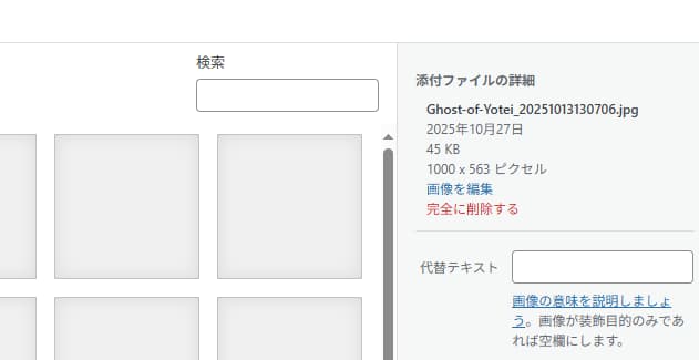 メディアライブラリー上からのっぺらぼうを選ぶと、その画像の詳細情報が確認できるのです。