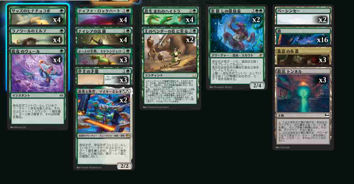 現環境でも、実は緑単上陸デッキって一定以上あるんですが、それらは若木の育成場だったり、強靭形態の調和者だったり、ちょっと重めのカードも採用されている場合が多いのですが、このデッキはそういったものは入れず、あくまで早い段階でのワンショットを意識して作っている感じですね。